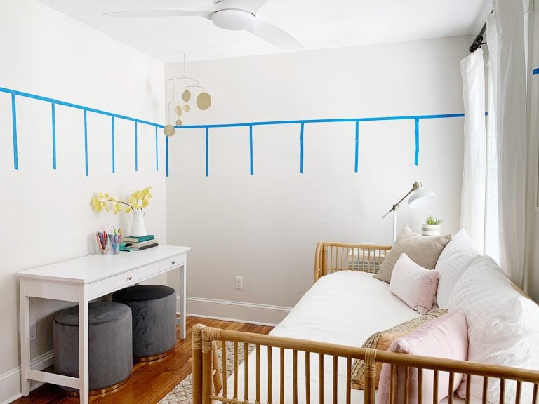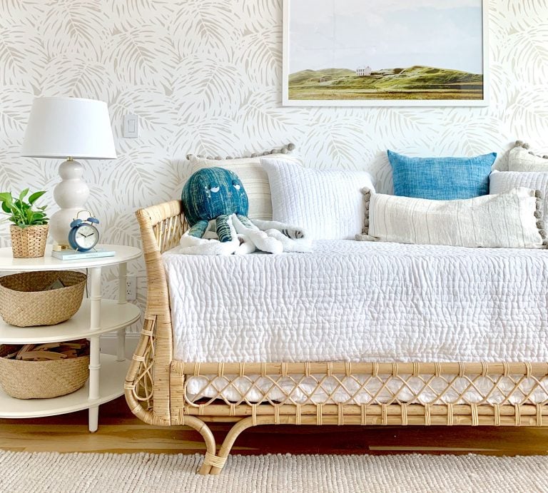 Adding wallpaper to the middle bedroom at our beach house took us just a few hours and cost us less than $100. It’s a whole lotta bang for not much buck (or extra high skill level). Plus it’s 100% removable so if we ever tire of it or want to swap it for something else, it’s no big deal. Certainly less trouble than removing traditional wallpaper! So in this post we’ll show you exactly how we hung it, including a video I took of my lovely husband hanging a panel for you in real-time while I talk and point (you know, the things I’m most known for). Selecting Your Wallpaper There were two strategic choices