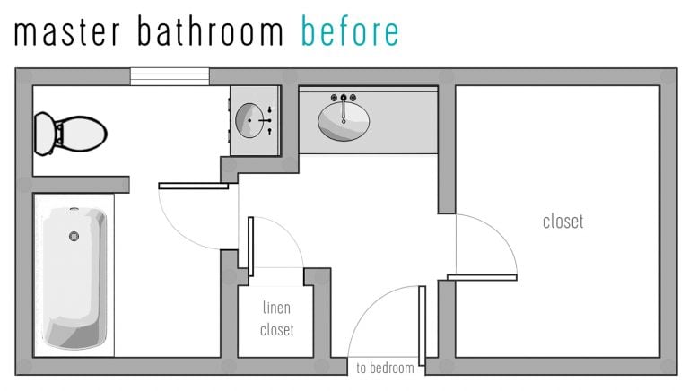 Ok, now we’re cooking with gas! Maybe I shouldn’t use that expression for a bathroom reno… ANYWAY… we’ve made lots of progress since partially demo-ing the room last week (more on that here), and wanted to share our final floorpan with you (IT’S SUCH A GIANT IMPROVEMENT!) and our final tile picks (along with a few other things we debated, why we chose what we chose, etc). So here’s the old bathroom layout. Yes we lived with it like this for over six years. Yes, it was A LOT of doors (the one leading from the hall to our bedroom is right behind where the tub is below – so there were five in a