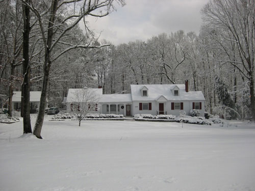 You guys probably remember us mentioning “the bed & breakfast” house around the corner from us a few times. We’ve admired it for years. Not just because it has an in-ground pool, a tennis court, and a picnic area, but also because it’s just about the most charming exterior around. Here’s a pic we snapped during a snowstorm last year: