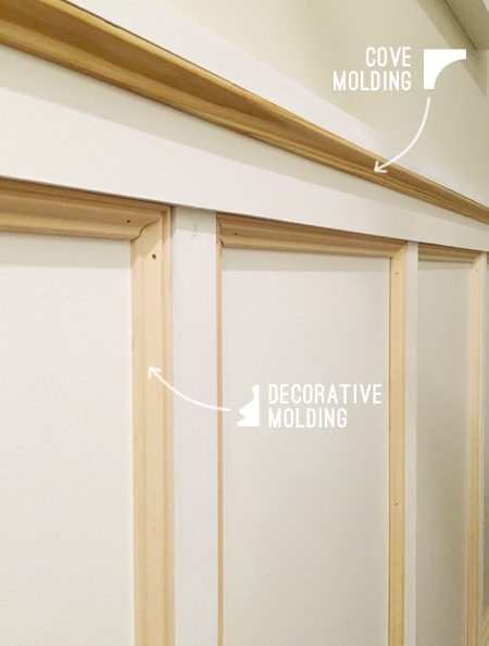 We bought some decorative shoe molding at Home Depot that fit nicely within the panels we had already created, giving it a more intricate profile. To install it, we just held up strips along the inside edges of each panel’s four sides, marked the ends, and then made miter cuts on a 45-degree angle so the pieces could be nailed into place like a picture frame. We didn’t use any construction adhesive behind the boards, because we found the finishing nails were enough last time.We also opted to add some cove molding under the ledge, which also gave it a more traditional look.