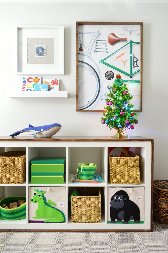 What’s new this year is our son’s tree, since he can finally be trusted with one of his own. He picked out this green tinsel tree himself ($8? sold!) because, well, he’s three and it was just about the coolest thing he’d ever seen. Scratch that – it was the coolest thing he’d ever seen once we added a string of colored LED lights to it. Each year we let the kids pick out some new soft ornaments for the shared tree in the bonus room, but we let him sneak his favorite one (this knitted wreath, which he lovingly calls his “Christmas Donut”) onto his tree, along with some shatterproof balls.