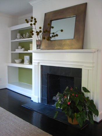 Here’s the entryway complete with an welcoming fireplace that greets you at the door. We loved their built-in bookcase with a green accent wall behind it. And we also adored that gorgeous white mantle, chic slate fireplace surround, and the handsome ebony hardwood. Again please excuse their empty bottom shelf- they just moved back into their home and had a baby two days later. They’ve been pretty busy these days!