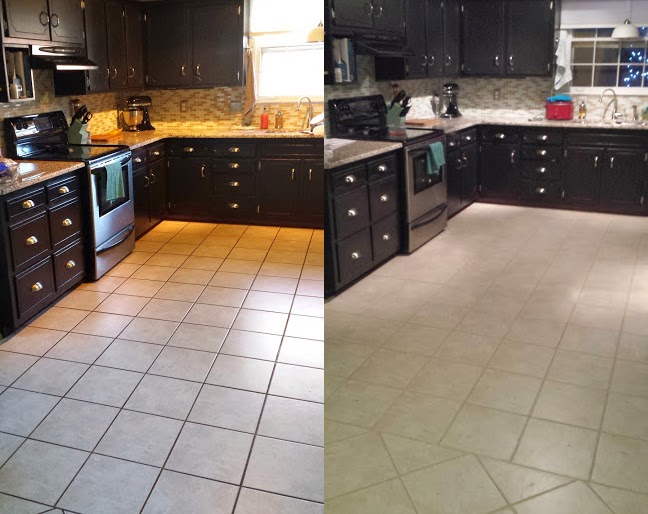 *Picks jaw up off her desk* This is AWESOME!! The cream tile with brown grout in our kitchen has been the bane of my existence for the past 5 years. We’ve been wanting to update it (phase 1 style) but couldn’t decide what we wanted to do. We will eventually replace it later on when we remodel our kitchen. This is the perfect solution!