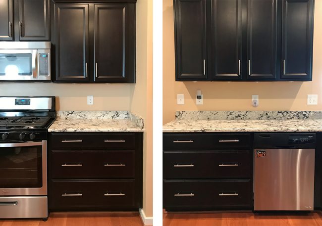 Along this stretch of wall, we chose to install the tile wherever the existing granite backsplash ran, which seemed to look the most intentional (like they had always been there, installed together at the same time). In the past we have removed that short piece of granite so the tile can go right to the countertop, but in this case they worked so well together that it felt better to leave it there – especially since it wasn’t worth the risk of damaging someone else’s granite counters in an attempt to get it off.