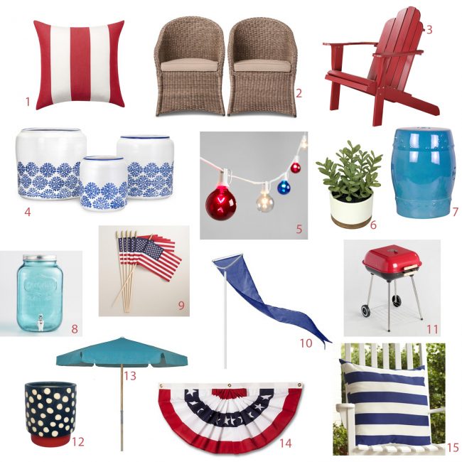 My favorites are those woven chairs (#2) even though they’re not red, white, or blue because they’d look awesome with a red and white striped pillow on them (#1) and I also LOVE the blue umbrella (#13) – we have a similar one on our back deck and it’s awesome. I’m also FEELING that trio of planters (#4) – don’t those designs look like little fireworks?! LOVE. Also, those red white & blue string lights (#5) are awesome and I can’t get enough of that little red grill (#11) or the blue drink dispenser (#8). In summary: GIMME ALL OF THE RED, WHITE, AND BLUE THINGS.