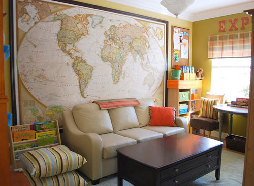 Oh, wow, that is amazing! The map is such a great feature of the room. I love the punches of orange and the organization, too. Fabulous job, Kate!