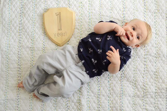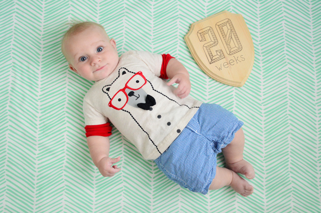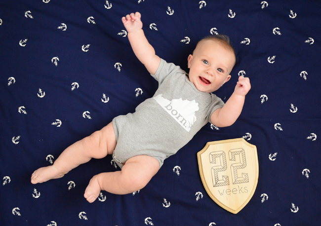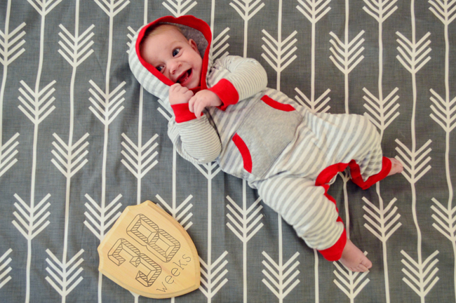 It all started with our daughter Clara’s weekly photo project when we had her in 2010. Then Teddy was born in April of 2014, and we had fun putting a slightly different spin on those weekly baby pictures to capture his growth. We didn’t want to completely reinvent the wheel (we really liked how Clara’s turned out) so Teddy’s photo project has the same core elements: baby + fabric + photoshopped age.
