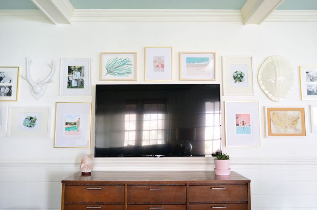 Some say gallery walls are trending out in favor of larger scale art. Maybe. It makes sense that picture gallery walls on every wall (especially the ones with a ton of tiny frames) might feel a little less “new and fresh” these days. But I’d argue that a collection of picture frames hung together on the wall feels pretty classic if you stop and think about it. Watch Home Alone. They totally have a gallery wall going up their formal staircase in the foyer where Kevin sleds and hurls paint cans. But one spot I love for a gallery wall these days is actually around a TV. Why? Well, that big black box isn’t exactly gorgeous.
