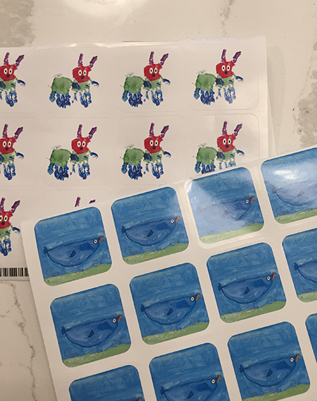 If you don’t have readymade stickers, you can just scan or photograph any favorite piece of kid art and print it out on sticker paper. Or do regular paper and Mod Podge them to the wood surface. Either way – so easy and such a cute way to keep track of something that might otherwise get lost or stashed in a box forever instead of being enjoyed.