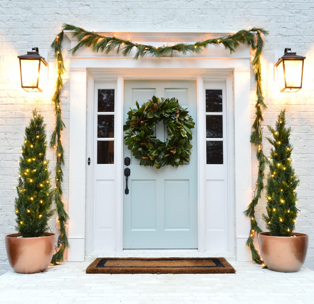 You know we painted our front door a new color back when we painted our brick house white in October, and I even mentioned back in that post that I used a new-ish specialty paint that’s made for front doors. It’s called Grand Entrance by Benjamin Moore and the paint color is Tranquility also by Benjamin Moore, and it can either be made in a satin base or a super hyper glossy mirror finish base.